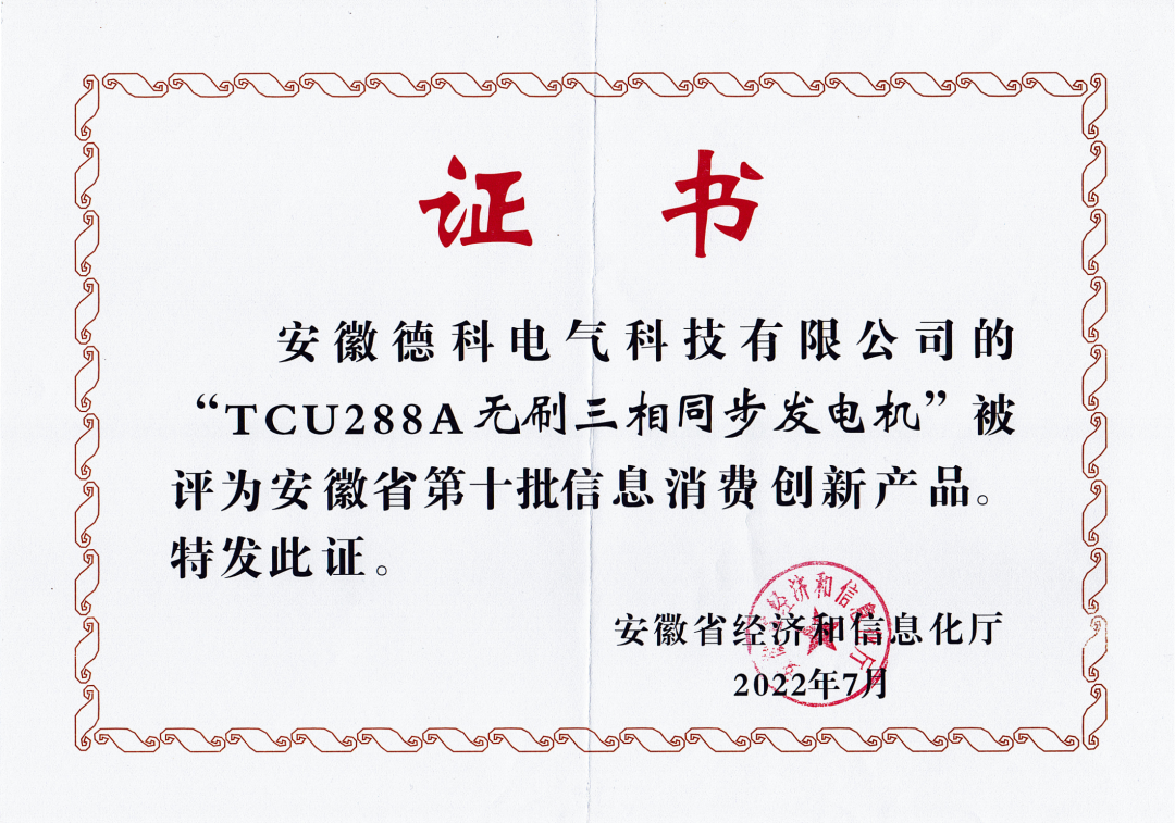 根據《安徽省新產品認定暫行辦法》(皖經信科技函120171880號),安徽省經濟和信息化廳組織開展了2022年第一批安徽省新產品認定工作。經專家評審,認定安徽德科電氣科技有限公司〝TCM428D船用發(fā)電機〞 等113項產品為2022年度安徽省新產品。