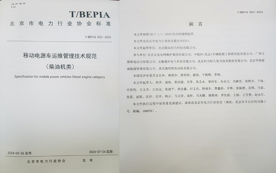 2024年7月26日,《移動電源車運維管理技術規范(柴油機類)標準號:T/BEPIA 002-2024》正式發布實施,該標準由北京市電力行業協會提出,北京聯眾同力科技有限公司牽頭,北京京電電網維護集團有限公司、廣西玉柴船電動力有限公司、安徽德科電氣科技有限公司等單位參與起草制訂。