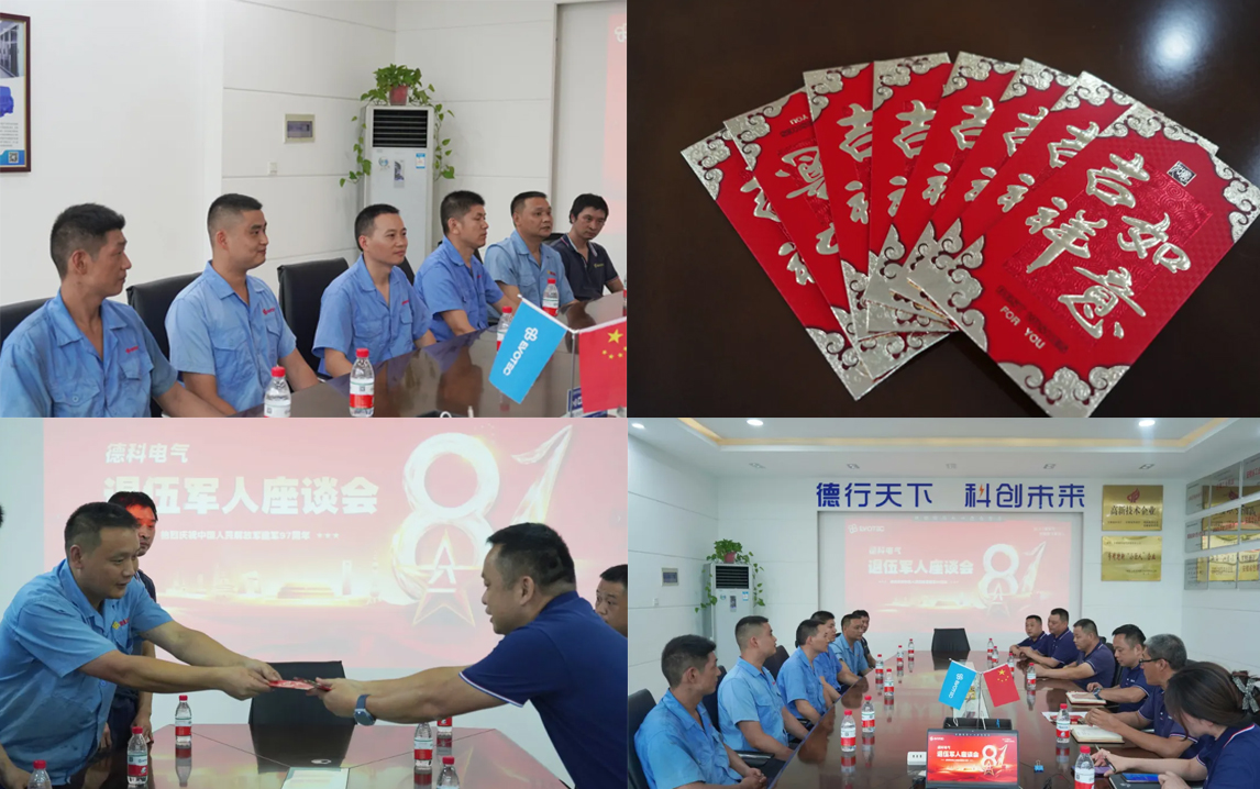 為了進(jìn)一步弘揚(yáng)擁軍優(yōu)屬的光榮傳統(tǒng),德科電氣組織開展“八一建軍節(jié)退伍軍人座談會”。會上,總經(jīng)理王遠(yuǎn)鋒首先代表全體員工向8位退伍軍人送上美好的節(jié)日祝福,并對退伍軍人在公司發(fā)展過程中做出的突出貢獻(xiàn)給予充分肯定,鼓勵(lì)他們繼續(xù)發(fā)揚(yáng)優(yōu)良傳統(tǒng)和作風(fēng),保持軍人嚴(yán)謹(jǐn)?shù)淖黠L(fēng)、嚴(yán)明的紀(jì)律和強(qiáng)烈的責(zé)任感,為公司的發(fā)展貢獻(xiàn)更大的力量。參會的退伍軍人們也結(jié)合個(gè)人實(shí)際,依次交流發(fā)言。會后,公司為退伍軍人發(fā)放節(jié)日祝福紅包,并集體合影留念。