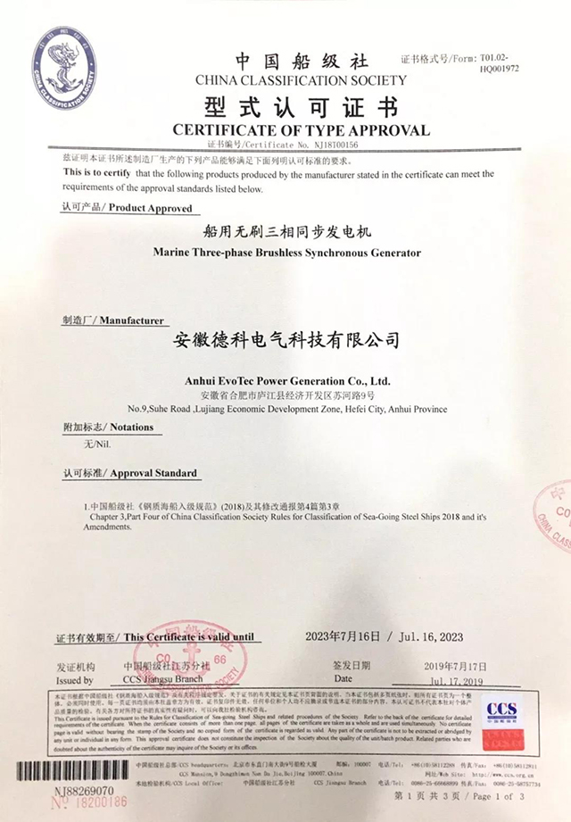 四、EvoTec德科船用發電機產品通過了中國船級社(CCS)認證